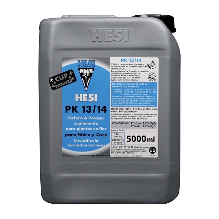 HESI PK 13/14: Las plantas tienen una mayor necesidad de fósforo y potasio en la fase de floración, aplicando HESI PK 13/14 cumplimos completamente esta necesidad.