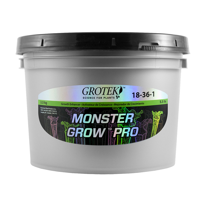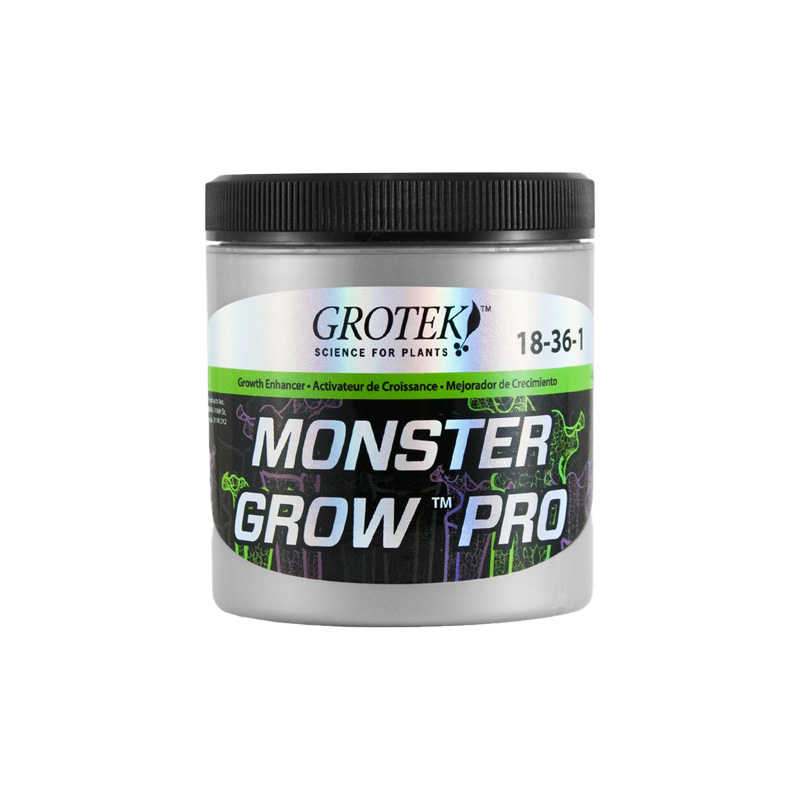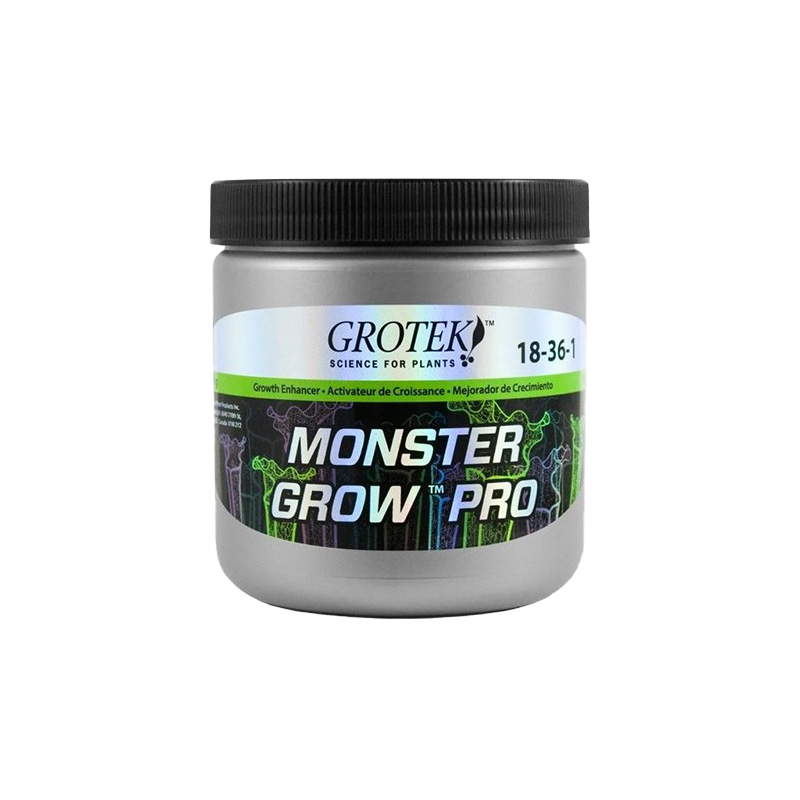 El contenido de Grotek Monster Grow Pro es de NPK 18-36-1, lo que significa que contiene 18% de nitrógeno, 36% de fósforo y 1% de potasio. Los ingredientes activos son fosfato diamónico, proteína de soja hidrolizada y extracto de algas marinas.